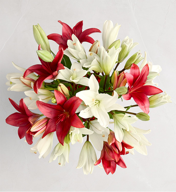 They’ll love the festive beauty of our holiday lily bouquet! These radiant red and white blooms are paired together, bringing joy and cheer to family and friends, near and far.